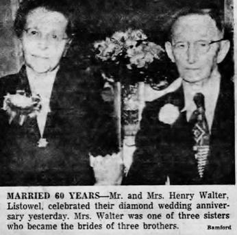 A lifelong resident of this district, he was born on Nov. 21, 1986, in Wallace Township, a son of the late Michael Walter and his wife, the late Barbara Heinmiller. He farmed in Wallace Township before retiring to Listowel in 1951 he was a member of Calvary Evangelical United Brethren Church.
